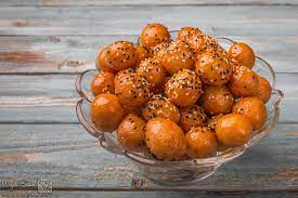 겉은 바삭하고 속은 부드러운 작은 튀김 반죽으로 보통 달콤한 시럽을 뿌린 다음 참깨를 뿌립니다.